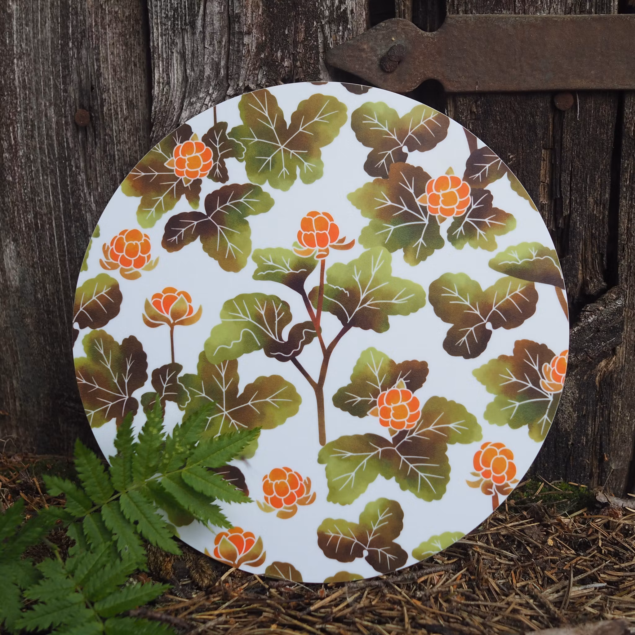 Runt grytunderlägg med hjortronmönster på vit botten i laminerad mdf tillverkat i sverige.
