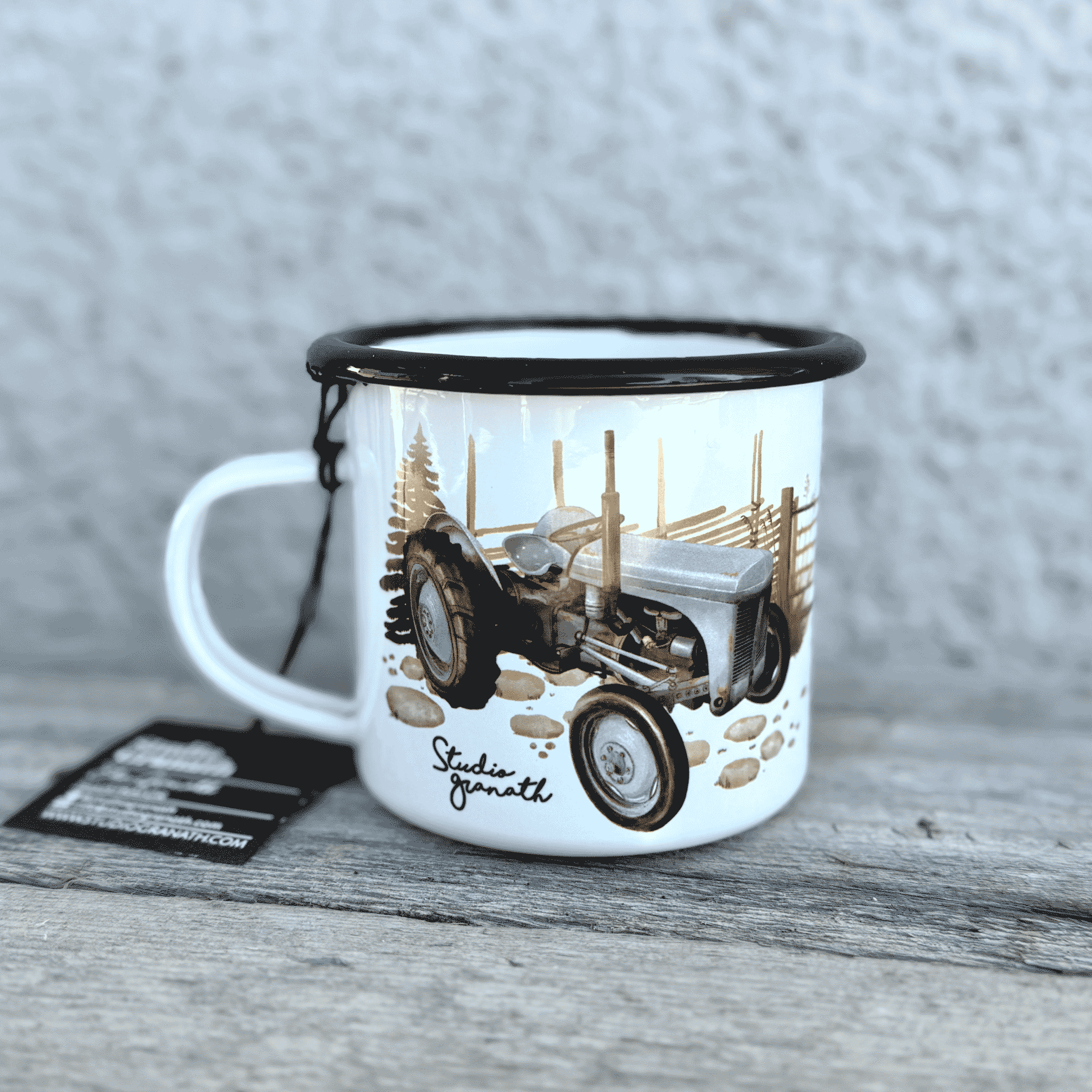Emaljmugg "Gammtrakor'n" med motiv av traktor, gärdsgård, gräs och granar. motivet sträcker sig runt hela muggen.