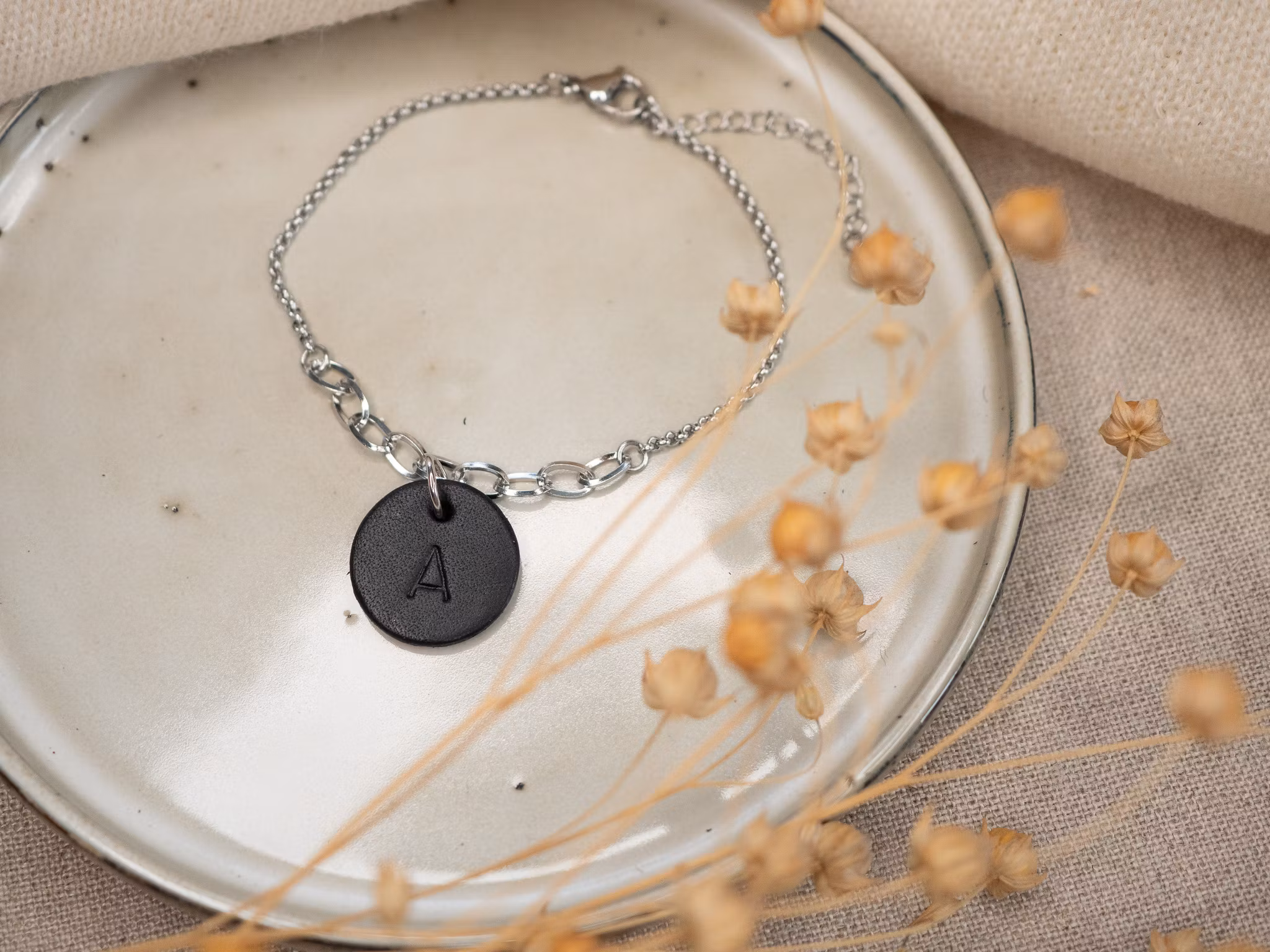 Bokstavsberlock i svart nötläder. monterad på armbandskedja av rostfritt stål.