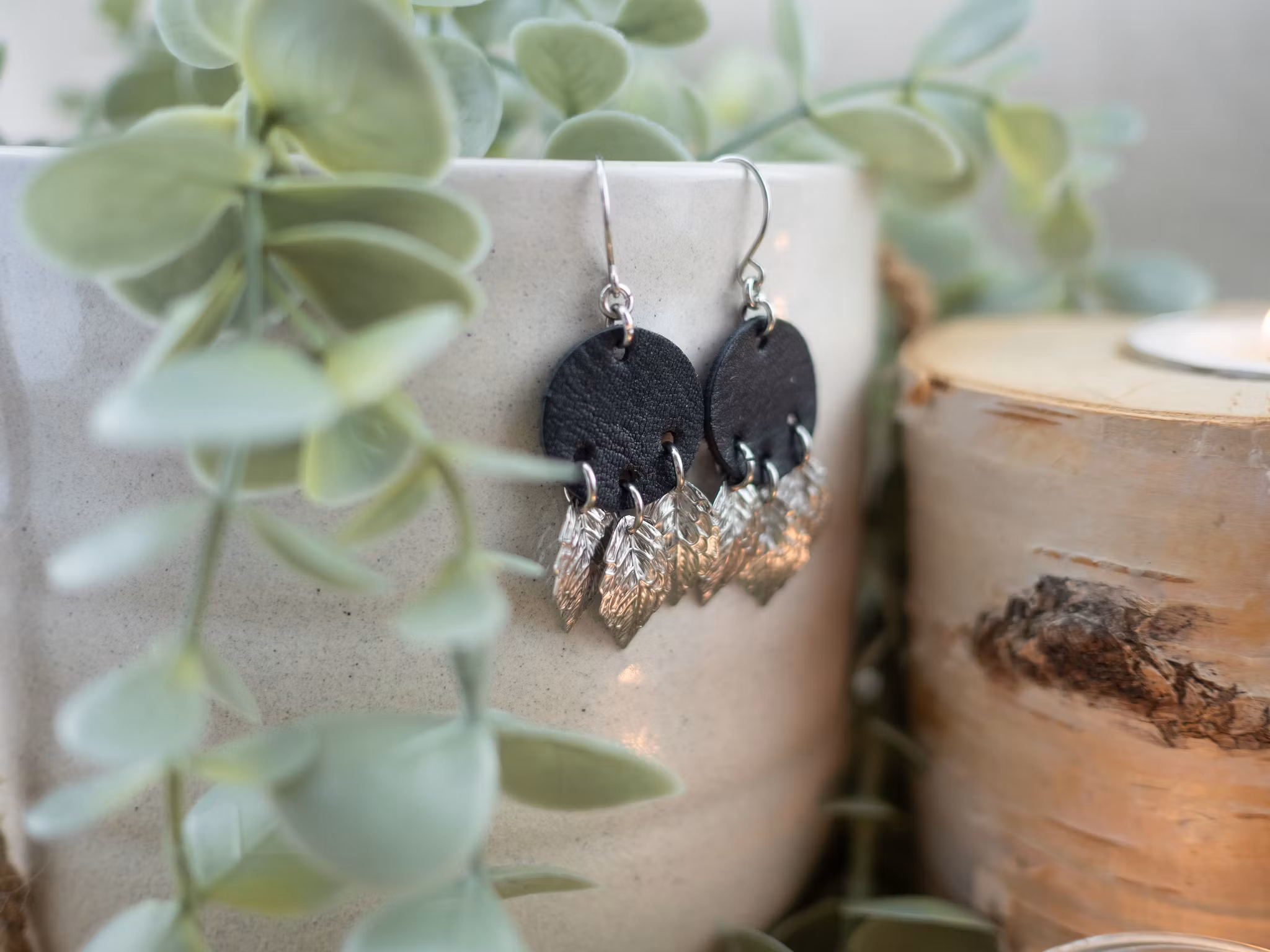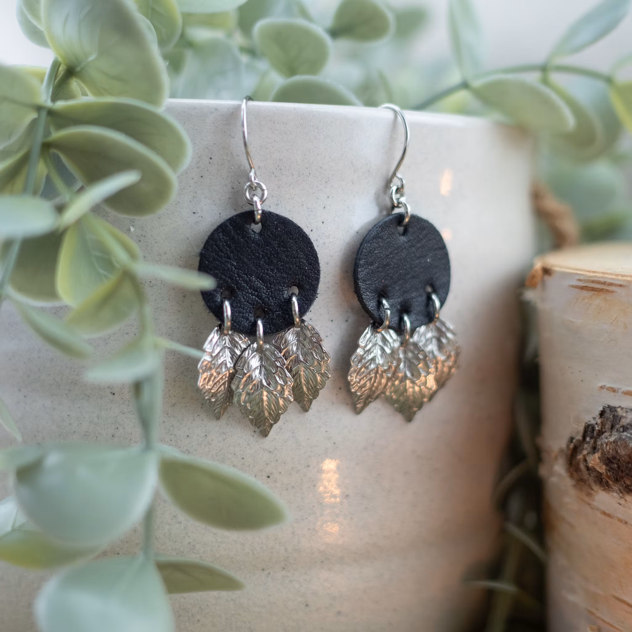Örhängen i rostfritt stål och svart renskinn .