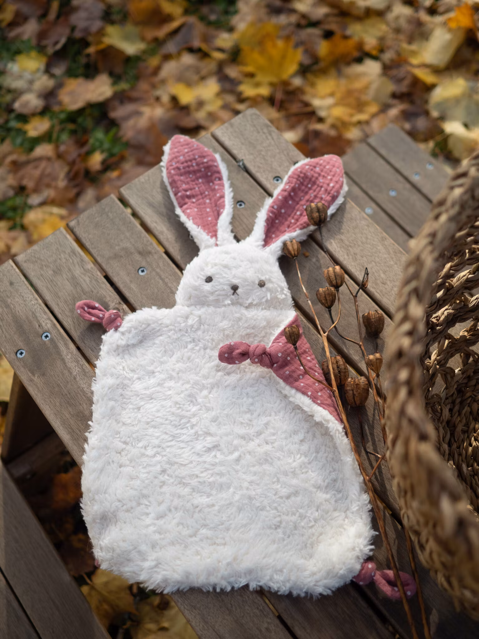 I beskrivningen sys kaninen i bomullsteddy och muslin. Men det går även bra att använda andra typer av tyger som exempelvis velour, minky eller jersey.